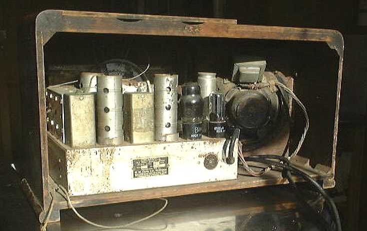 H.W.Clarke,after import restrictions came in, in 1936, asked Collier & Beale to supply them with radios. So they made chassis that Clarkes could fit into their own cabinets. In 1937 the Cromwell name was introduced in place of the earlier Radion. This is a 6 valve broadcast chassis, although there are only 5 valves in it. When plugged in, it just has a loud hum, which doesn't change with volume control movement etc. I have an idea it may have been converted to solid state rectification, but won't know till the chassis is pulled out. The dial cord to the needle is broken, although the part to the tuner is still OK. It would appear to be of about 1947 manufacture. Obviously, the "lovely" grill cloth has been replaced at some stage. But it has been done pretty well. The name plate is taped on the front, but at least it is there! It now runs quite well, still with only 5 valves. It has been converted at some stage. Unfortunately the dial needle is missing. The name plate has now been put on properly. Click on pictures below for large versions. Note the different types of wood which are not noticeable in the Before view. This 1936/37 dual wave 5 valve radio was not working when received. I wonder why? Maybe the fact that there was a mouse nest under the chassis might have had something to do with it! There were droppings, of course, and a huge amount of hay or grass husks etc. Plus there was a hole in the electro-mag speaker of about 2 square inches, on the outer rim area. When plugged in, the 80 rectifier valve glowed red all through, indicating a probable short in an electrolytic capacitor. Sure enough, someone had replaced one of the electros, but it was faulty. I removed the incorrect 32 mfd and replaced it with a 10 mfd and the short disappeared. I also replaced a couple of other caps at the same time. However there was now an almighty hum and scream! At least this confirmed the amplifier and speaker were working. After cleaning the screen covers around the valves and ensuring they were earthing properly, especially the 6D6, it settled down nicely. On the electrical side of things, this just left the dial restringing, tuning and repairs on the 8 inch electromag speaker to be done. It is now working pretty well, and looking real good.