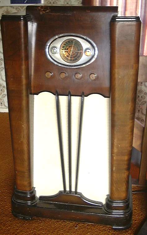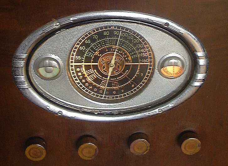 Click on pictures below for large versions. This 1936 radio, model 7AW, has a 7 valve, plus magic eye, chassis. It is all wave, 1 broadcast and 2 shortwave bands. It has a 12 inch Operadio electromag speaker fitted. The cabinet was made by G. C. Goode & Co Ltd. The dial has a "second hand" as well as the double ended main hand. This makes it easier to tune to the correct position next time. Especially on shortwave. The Eye is on the left, and works very well, which is a bit unusual these days. To balance that is a similar place on the right. It is labeled "Quality" on the left, "Volume" on the right, and "Band" down the middle. This lights up and shows the position of the tone, and volume controls, and which of the 3 bands is selected. This can be seen more clearly on the large picture of the dial. |