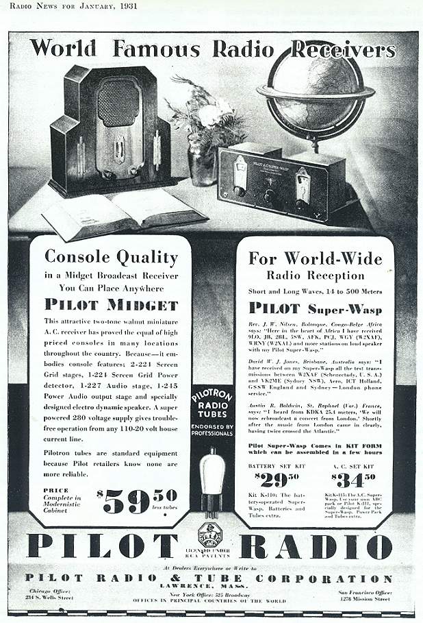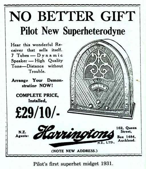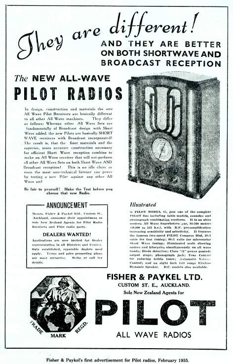Pilot Radios were originally imported from the USA by Harringtons Ltd, but then the agency was taken over by Kodak(NZ) Ltd in 1934. Fisher & Paykel Ltd took over the agency in 1935, and in 1936 started assembleing partly completed chassis and housing them in locally made cabinets made by G.C. Goode Ltd. This continued until the War prevented importing any more sets. The chassis on this Model H660 has 5 valves plus the magic eye. The electromag speaker is an 8 inch one, made by Pilot. It has a 2 gang tuner. There are 2 shortwave and one broadcast bands. The "dial" as can be seen, is a large revolving drum. There are 2 light bulbs that shine through the drum, plus separate bulbs that individually light up to show which band is in use. It was made in USA approximately 1937, although probably assembled in NZ.