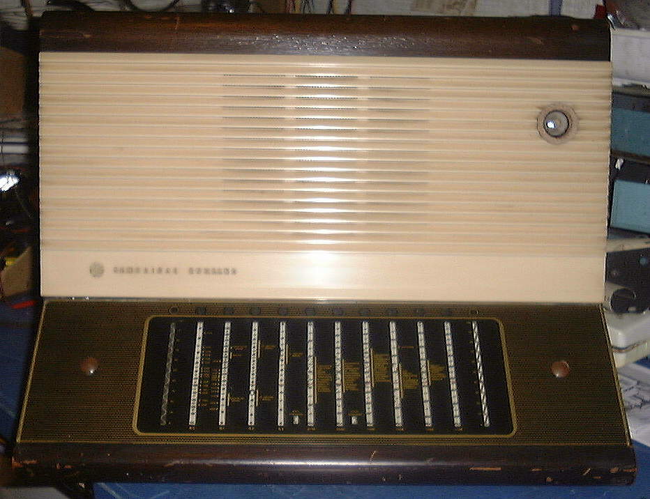 The PZ92 is quite a large radio. It is also a 4 valve plus Eye. Wooden case, 4 shortwave and broadcast. Click on picture below for large version. This little beauty model PZ60 has 10 bands plus gram input. Although, it's not so little! It has 6 valves plus magic eye, and an 8" speaker. It really pulls in the shortwave stations, by the dozen, if not hundreds! Even in daylight it does well, which is not so easy these days, with all the sources of interference now around. It also has pretty good sound. The on/off/tone and volume are on the left side and tuning and band selector are on the right side. Click on picture for large version of this 1964 advertisement. 80KB |