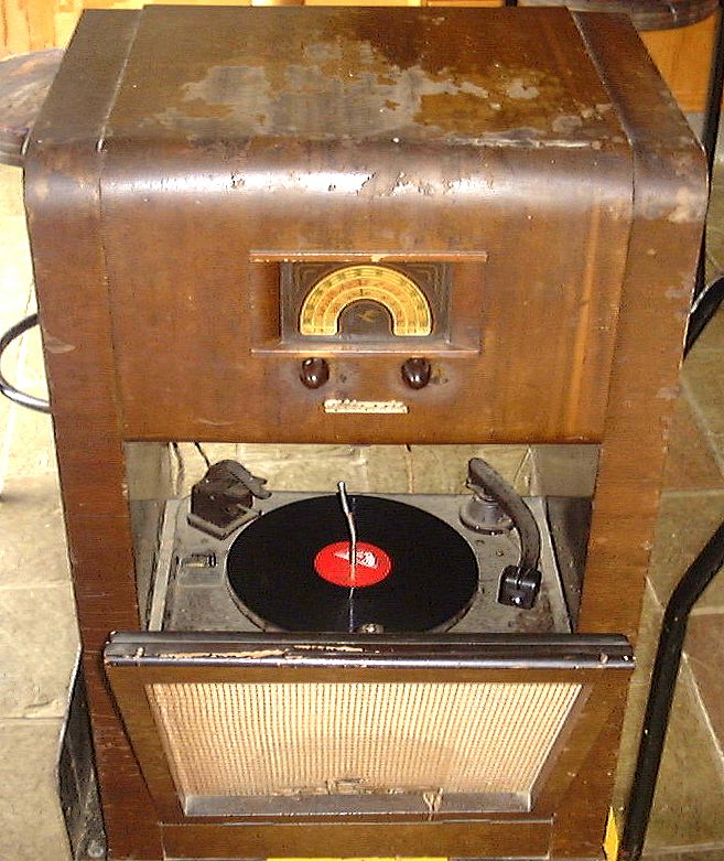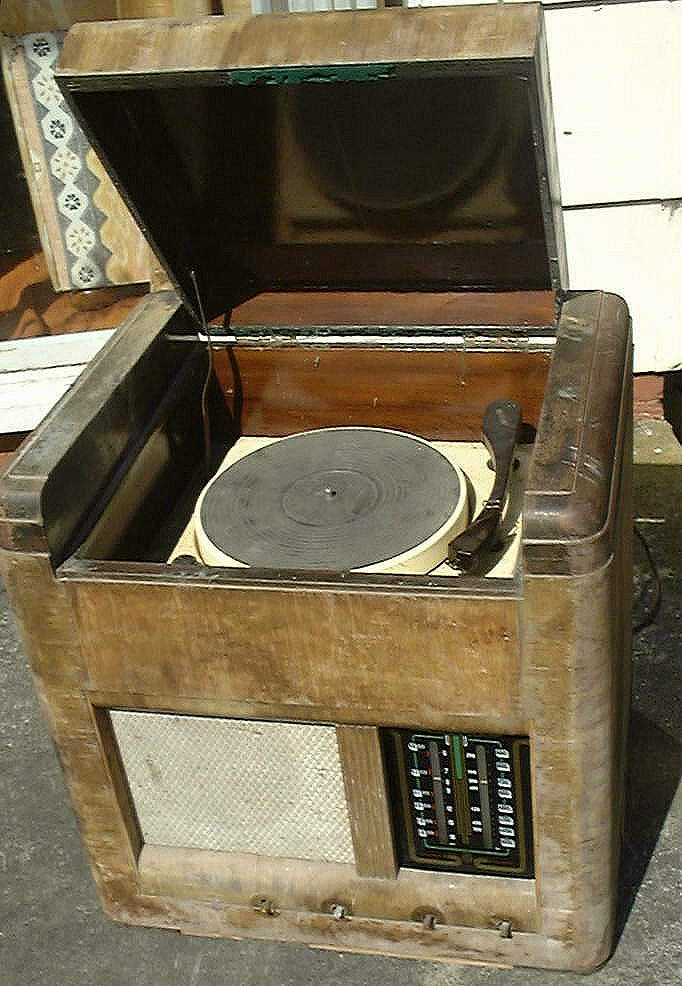 This radio looked in real bad condition when received. But it came up pretty well, considering, and it still has the original wooden knobs. It's from about 1947. Broadcast only, no shortwave. The dial shows separate North Island, South Island, and Australian stations. Currently, it is a 5 valve chassis, but a 6th valve used to be immediately above the power cord, in front of the power transformer. At some stage, someone has converted it to solid state rectification, instead. The Loop Antenna can just be seen sitting vertically at the left. Click on image for full size advertisement picture of the Loop Antenna used in this model. (127KB.) Although made by a different company, Radio (1936) Ltd used them for a short while. This is a 5 valve broadcast chassis, with a 6 inch electromag speaker. The tuning knob sits right in the middle of the dial, direct drive. The only other control is the volume. There are no dial lights, and it is a relatively small radio. I wonder if it may have been intended as a cheap radio, for its time. This one was made about 1937 according to the ARTS&P sticker, but the manufacturer's plate on the back of the chassis has no Manufacturer's name on it. I would have expected it to say Ultimate (1936) Ltd. Bit of an enigma, there! As received, it has a damaged dial plate, but at least it was there, and a number of wires are disconnected, so somebody has obviously "got at" it. Click on the pictures for large versions. Junior picked up two of these extension speakers at a second hand shop. Eight dollars for the pair. Not too bad. They are bakelite cabinets, in good condition, apart from needing a good clean and polish. The speakers are 8 inch, and each has a volume control on the right hand side. The brackets on the back would help to strengthen the cabinets, I guess, but are mainly intended for mounting the speakers on a wall. They do both work. There was a radio made by Radio 1936 Ltd that got to be nicknamed "The Hanging Horror". It was made inside a cabinet the same size as these speakers. Some were the same, but others had some bars across the grille area. The reason for the nickname was the fact that most were hung from a cord, which had a habit of breaking, in which case the radio hit the deck, and often damaged the cabinet. So they are fairly rare in good condition. The same goes for the speakers. Click on the pictures for large versions. This RAC model from 1950 has a 5 valve chassis, broadcast only. The 78 RPM gramophone, which uses steel needles, sits behind the pull out door, which also has the 10 inch Rola speaker mounted on it. There are two controls on the side for tone and switching from radio to gram. The radio is going, but with a very loud hum. There doesn't appear to be as much gain as there should be, on gram setting. The gram appears to be trying to work, but not quite succeeding. I don't think it will take too much to have it running well. It was obtained cheaply from a second hand shop. When I dropped in, he said he had this old radio he'd just got, but it was still on the truck, outside in the rain, if I wanted to have a look. So obviously, one doesn't say no. But as you can see, I also said "Yes". Click on the picture for large version. This model RL table-gram, as you can see, is not in the best of condition. As received, it was not running. The rectifier was missing! Replacing a couple of electrolytic capacitors, and 3 paper caps sorta got it going. Replacing another valve then made a big difference, but it still cut out at higher volume, and went all distorted. This turned out to be a capacitor from the volume control wiper. That soon fixed it! It now goes really well, heaps of volume, and really drags in the shortwave. It's a 6 valve, dual wave, with an 8 inch permag speaker. 1946/47. Now we need to look at the 78 rpm turntable, and do the cabinet. |