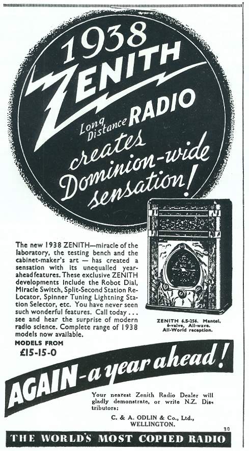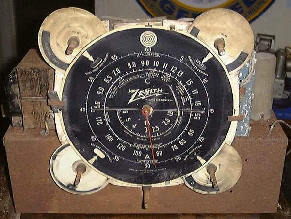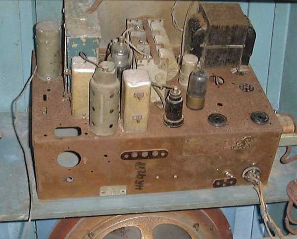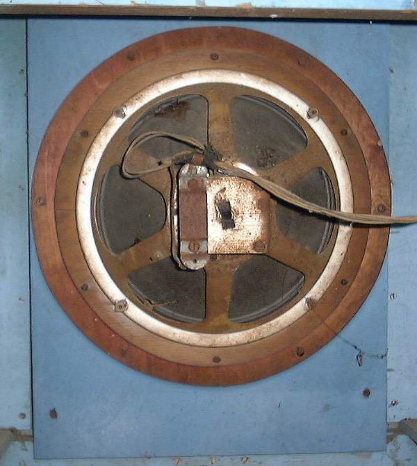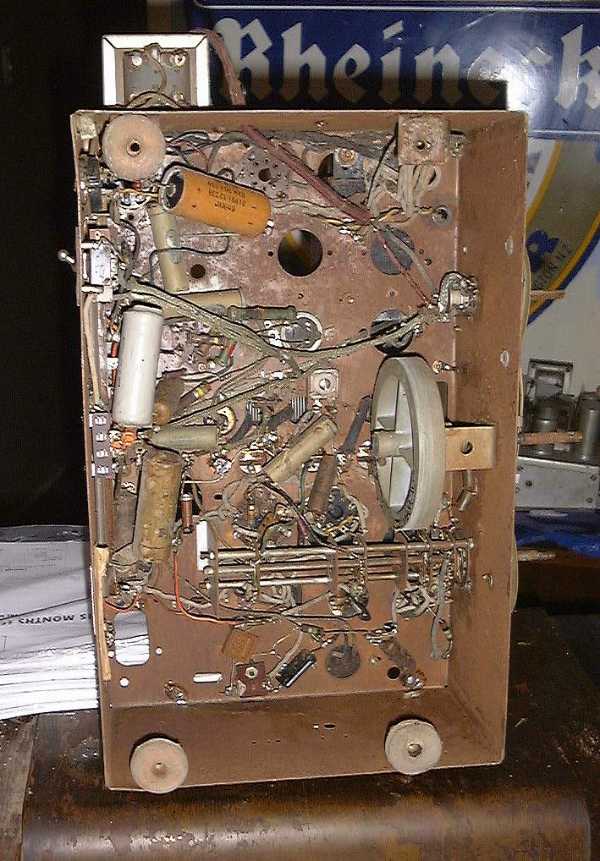 All the following photos have links to much larger, hopefully better quality pictures. Click on the individual photos to see their larger cousins. This 8 valve chassis has been extensively "worked on" in the past. And not very well, in some parts, unfortunately. The speaker output transformer has been moved to the side of the chassis instead of on the speaker, as can be seen above. At this stage I'm not sure of the year, but probably 1937 or 1938. Nor have I established a model number. The cabinet has some borer in it. The dial cover glass and the main station indicator needle are missing. The "second hand" is still there, however. The small dial on the top right is a local/distant switch. It is not connected to anything. The tuning gang seems to catch at times. It is possible that some of the small teeth on the gear drive may be slightly damaged. Three of the eight valves are AWOL, and who knows what the others are like? Or even if they are the correct ones, or in their correct places. The speaker is a 12 inch, but is mounted on two concentric wooden rings.These rings are each made from two 11/2 circles joined together with corrugated fasteners. I still have to check, but I wouldn't have thought Zenith would have used those. Plus there are holes in the cabinet at about the right places to mount a 15 inch speaker. So maybe that's what it was originally fitted with. Time will tell! The blue paint on the inside is the original factory paint.
